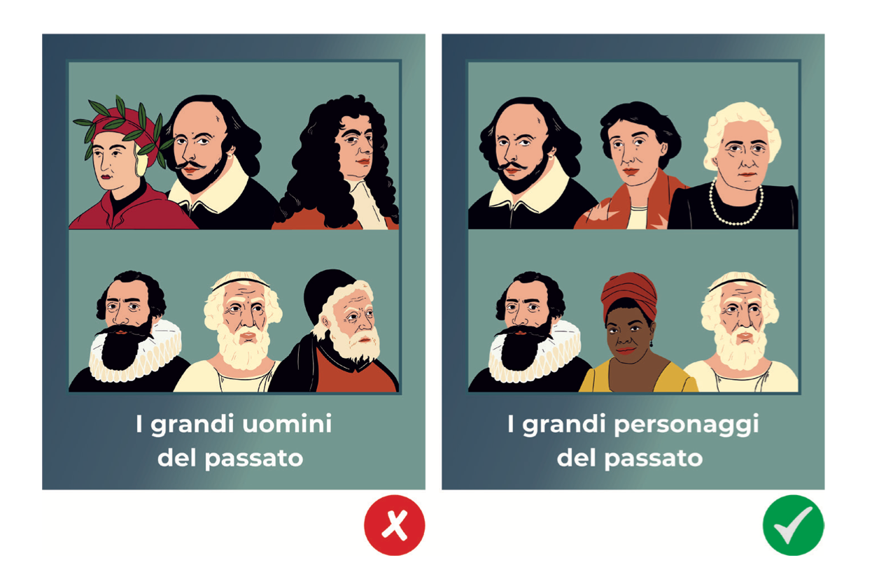 Ancora: quando si vuole rappresentare una collettività di persone in cui non è importante esplicitare il genere, è preferibile scegliere icone il più neutre possibili (vedi immagine di destra, sopra) al posto di figure che rappresentino inequivocabilmente un uomo (vedi immagine di sinistra), che reca con sé il concetto del “maschile sovraesteso”.