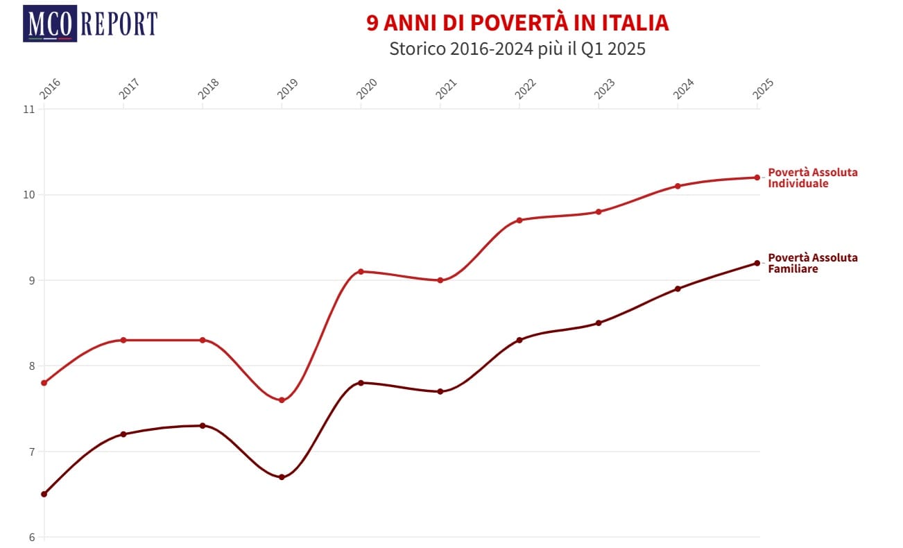 Oltre 5,7 milioni di individui vivono oggi in Italia in povertà assoluta, con un’incidenza che sale al 9,8% della popolazione, secondo l’ultimo report Istat sulla povertà. Non siamo davanti a una crisi temporanea, ma a un nuovo equilibrio sociale, fragile e pericoloso. L’Italia non sta migliorando: sta imparando a convivere con livelli record di disagio economico. La stabilità, in questo caso, non è un segnale positivo. È il segno che il sistema si è fermato nel punto più basso.