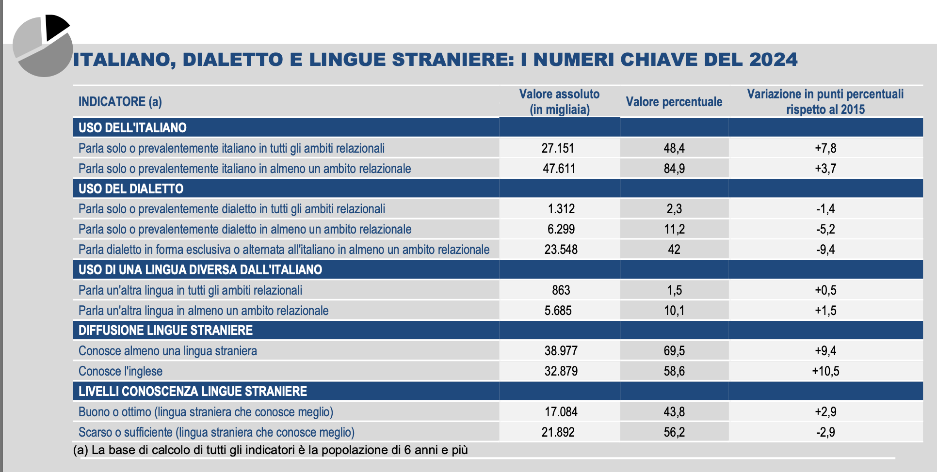 Sono, da sempre, le varietà linguistiche privilegiate per veicolare emozioni: molta parte della nostra anima, sosteneva Benedetto Croce, è dialetto. Essenziali, in molti casi, per raccontare il piccolo mondo antico dal quale stiamo fatalmente prendendo le distanze, complice la globalizzazione. E allora c’è da chiedersi se i dialetti resisteranno. O meglio: quanto resisteranno. Lo ha fatto, come ogni anno, l’Istat. E le risposte, inequivocabili, arrivano dal report “L’uso della lingua italiana, dei dialetti e delle lingue straniere”, diffuso in queste ore. Spazio ai numeri, allora. In quasi quarant’anni in Italia l’uso esclusivo o prevalente del dialetto in famiglia si è ridotto di oltre due terzi, dal 32% nel 1988 al 9,6% nel 2024. Nel 2024 quasi una persona su due (48,4%) parla solo o prevalentemente italiano in tutti i contesti relazionali (in famiglia, con gli amici e con gli estranei) percentuale in netta crescita rispetto al 40,6% del 2015. Pochi dubbi, insomma: secondo l’Istat “negli ultimi anni il quadro linguistico del Paese si è evoluto verso una crescente diffusione della lingua italiana a scapito dell’uso dei dialetti”.
