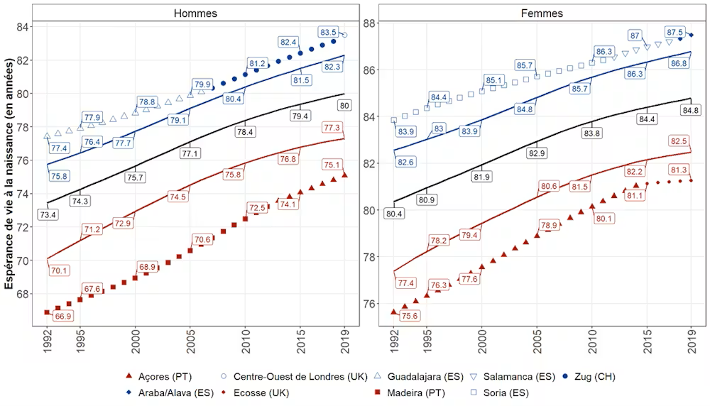 Il primo dato è sorprendente e va contro molte letture allarmistiche: la longevità umana non ha ancora raggiunto un tetto invalicabile. Concentrandosi sulle regioni europee più avanzate, non emerge alcun segnale di rallentamento strutturale. In queste aree l’aspettativa di vita continua a crescere allo stesso ritmo osservato nei decenni precedenti. Nel 2019, le regioni più virtuose includevano aree del Nord Italia, della Svizzera e alcune province della Spagna. In Francia figuravano Parigi e i dipartimenti circostanti come Hauts-de-Seine e Yvelines (sia per uomini sia per donne), insieme alla regione dell’Anjou e alle zone di confine con la Svizzera, in particolare per la popolazione femminile. In questi territori, l’aspettativa di vita ha raggiunto livelli molto elevati: 83 anni per gli uomini e 87 anni per le donne. Un dato che dimostra come, nonostante le preoccupazioni ricorrenti, nulla indichi che la durata della vita abbia toccato un limite naturale. Prolungare l’aspettativa di vita resta possibile. Il margine di miglioramento esiste ancora.